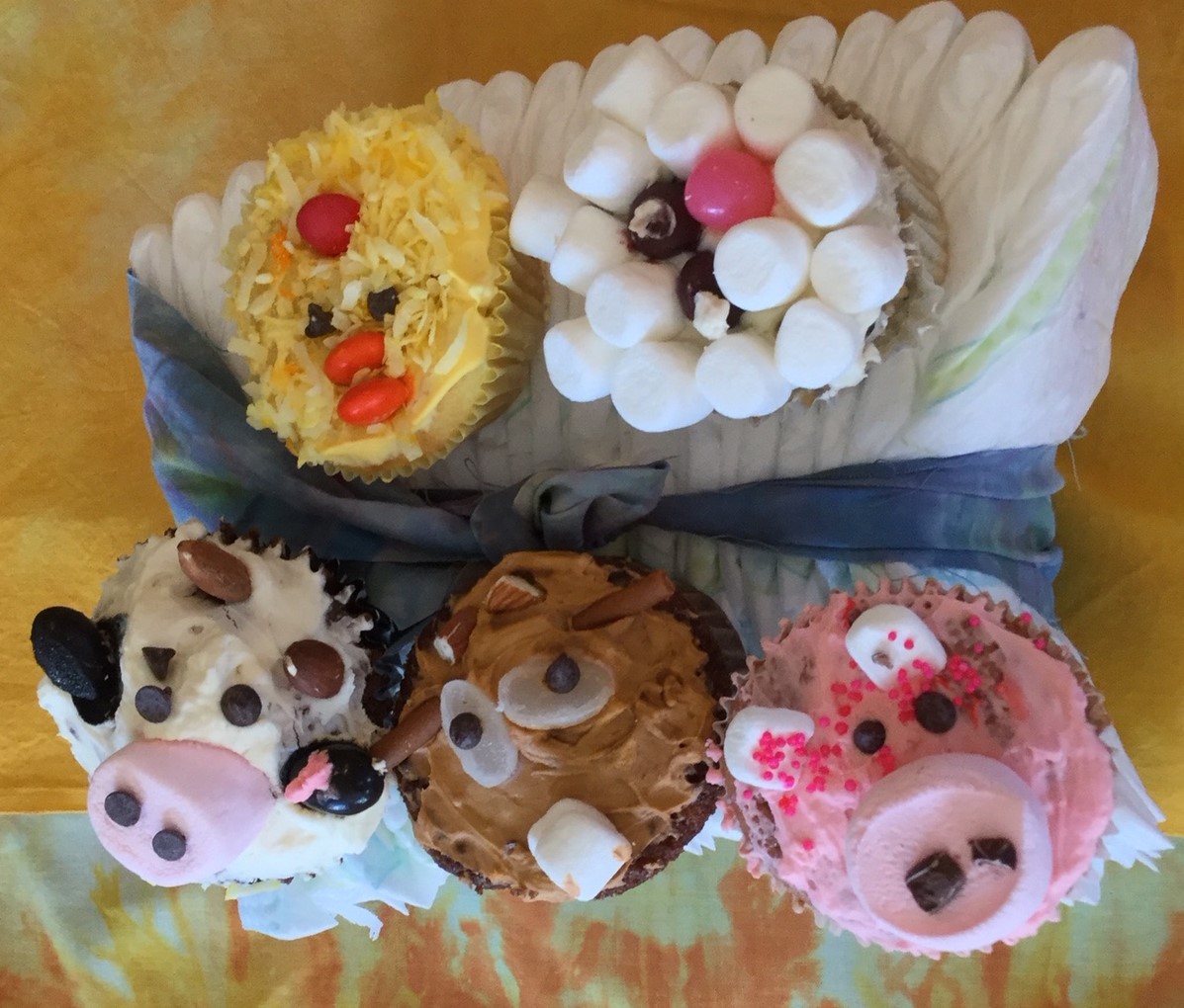 Since I'm here I'm also going to show off the handiwork of my beautiful granddaughters, Cedi, Capri and Pip, ages 11, 10 and 6. They helped host the baby shower for my daughter and made all these amazing cupcakes to match our farm animal theme. Cedi and I baked 5 different kinds of cupcakes and the 3 of them made 5 different fillings, filled them all and did all the decorations. They had to leave for a few hours in the middle of the day Saturday and I was instructed not to touch the cupcakes. They made a gramma proud...as they always do.